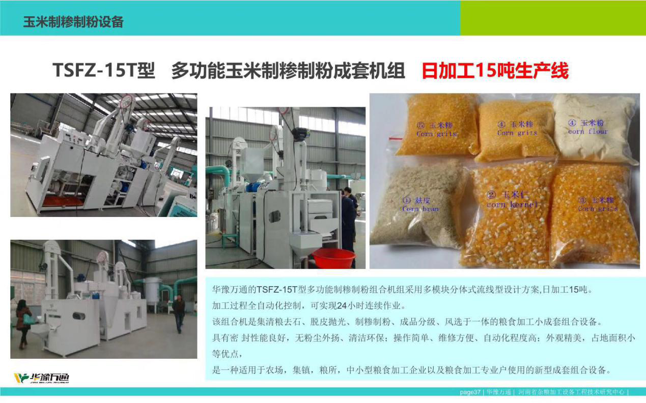 该系列玉米加工小机组主要由集清粮去石、着水调质、脱皮抛光、制糁制粉、成品分级、风选除杂和皮杂收集七部分组成。加工过程全自动化控制,可24小时连续作业具有密 封性能良好,无粉尘外扬、清洁环保;操作简单、维修方便、自动化程度高;外观精美,占地面积小等优点是一种适用于农场,集镇,粮所,中小型粮食加工企业以及粮食加工专业户使用的新型成套组合设备。